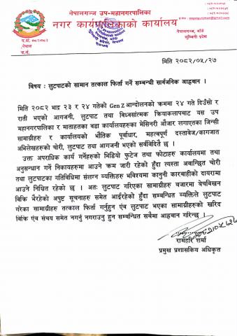लुटपाटको सामान तत्काल फिर्ता गर्ने सम्बन्धी सार्वजनिक सूचना आव्हान