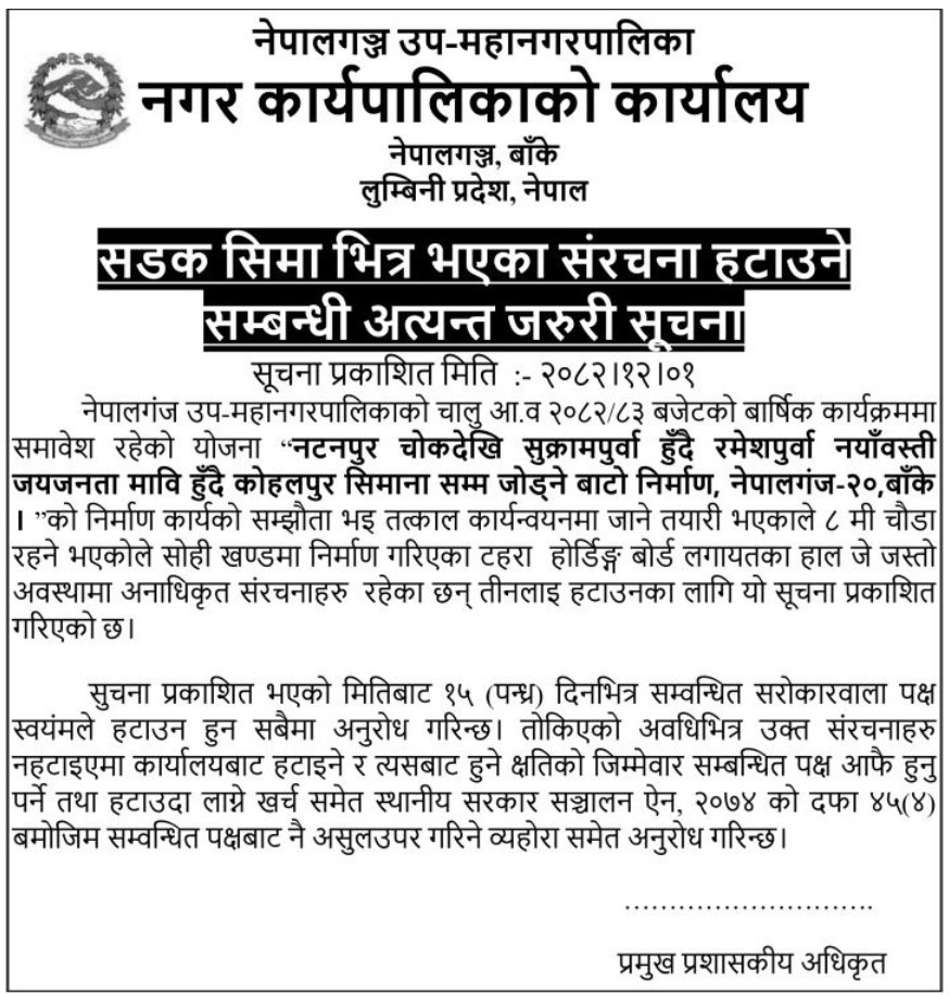 सडक सिमा भित्र भएका संरचना हटाउने सम्बन्धी अत्यन्त जरुरी सूचना !!