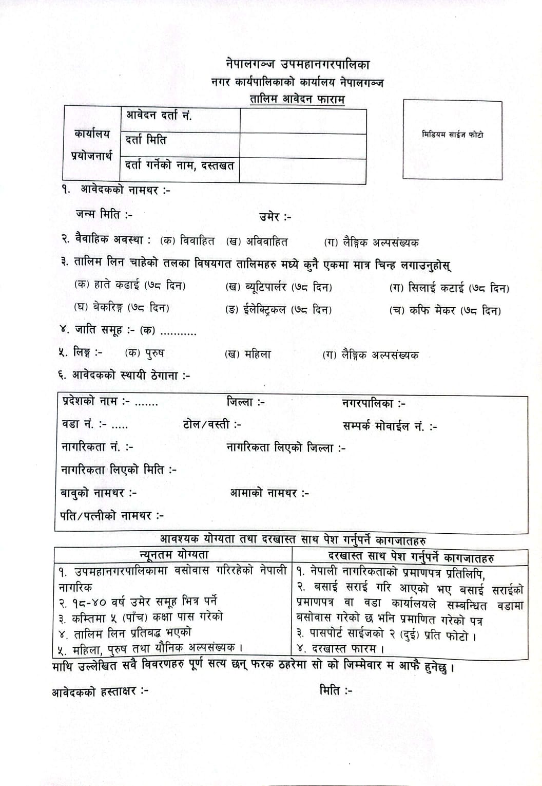 हाते कढाई, ब्यूटीपार्लर, सिलाई कटाई, बेकरिङ्ग, ईलेक्ट्रीकल र कफि मेकर तालिम लिन ईच्छुक प्रशिक्षार्थिहरुलाई आवेदन दिने बारे सूचना !! फारम सहित