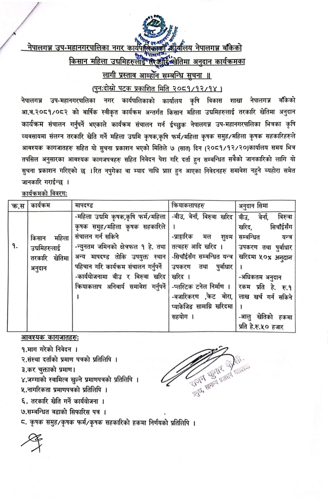 किसान महिला उद्दमिहरुलाई तरकारी खेतिमा अनुदान सम्बन्धी सुचना !!
