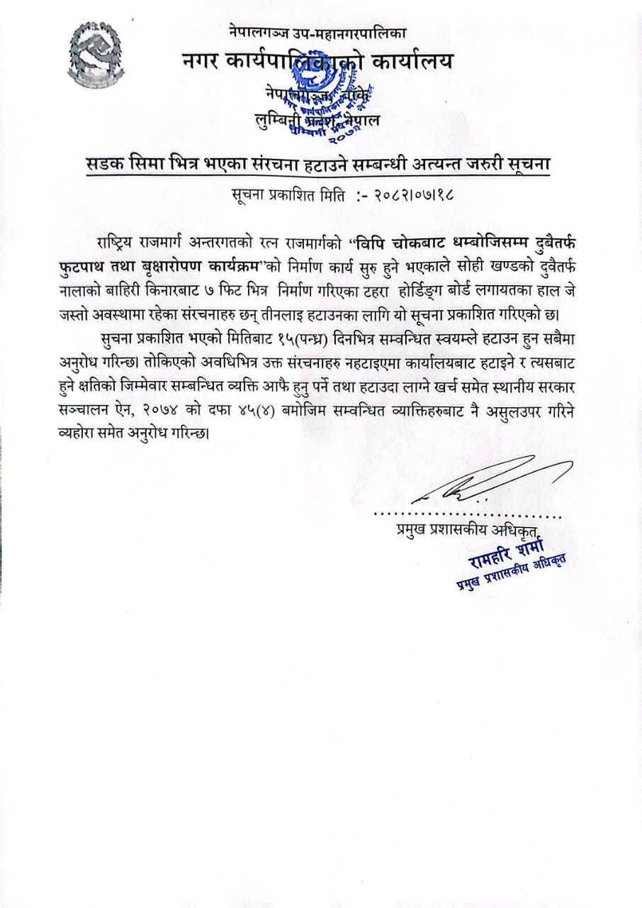 सडक सिमा भित्र भएका संरचना हटाउने सम्बन्धी अत्यन्त जरुरी सूचना !!