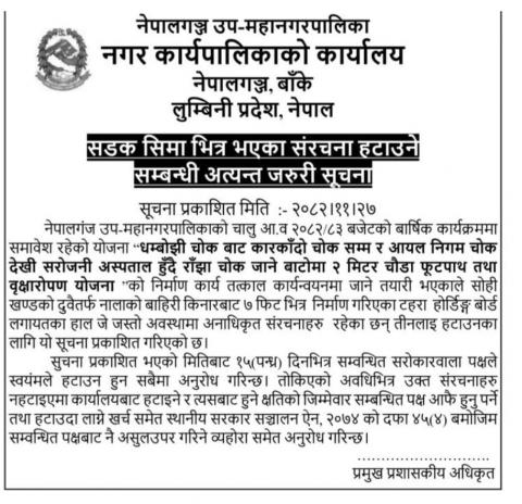 सडक सिमा भित्र भएका संरचना हटाउने सम्बन्धी अत्यन्त जरुरी सूचना !!