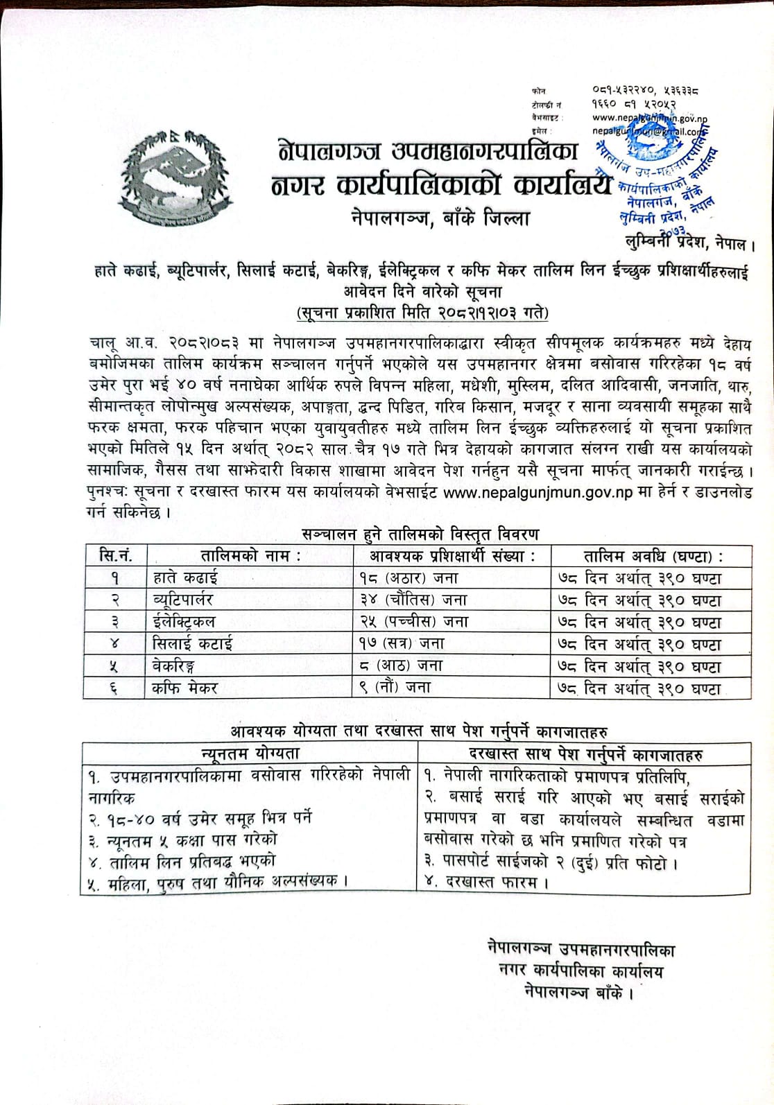 हाते कढाई, ब्यूटीपार्लर, सिलाई कटाई, बेकरिङ्ग, ईलेक्ट्रीकल र कफि मेकर तालिम लिन ईच्छुक प्रशिक्षार्थिहरुलाई आवेदन दिने बारे सूचना !! फारम सहित